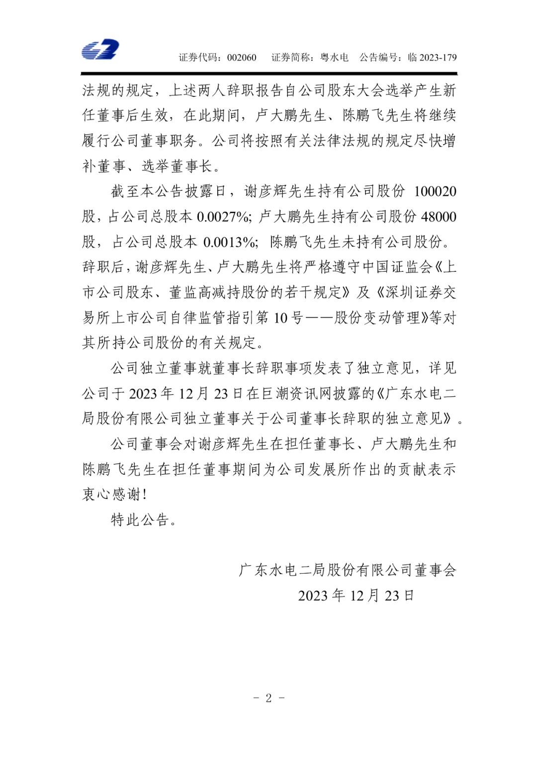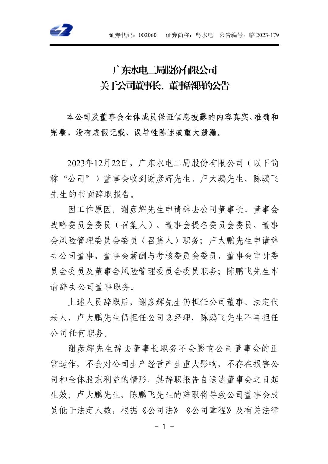 12月23日,粵水電發(fā)布公告稱,因工作原因,謝彥輝申請(qǐng)辭去公司董事長(zhǎng)、董事會(huì)戰(zhàn)略委員會(huì)委員(召集人)、董事會(huì)提名委員會(huì)委員、董事會(huì)風(fēng)險(xiǎn)管理委員會(huì)委員(召集人)職務(wù);盧大鵬申請(qǐng)辭去公司董事、董事會(huì)薪酬與考核委員會(huì)委員、董事會(huì)審計(jì)委員會(huì)委員及董事會(huì)風(fēng)險(xiǎn)管理委員會(huì)委員職務(wù);陳鵬飛申請(qǐng)辭去公司董事職務(wù)。
