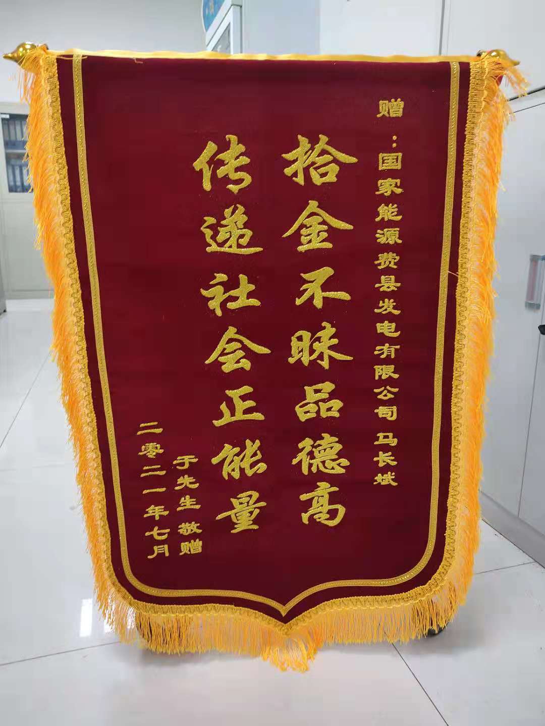 7月26日上午十點(diǎn),費(fèi)縣于先生懷著無比激動(dòng)的心情將一面錦旗送到公司東門值班室,錦旗上書寫著:“贈(zèng)國(guó)家能源費(fèi)縣發(fā)電有限公司馬長(zhǎng)斌:拾金不昧品德高,傳遞社會(huì)正能量”。