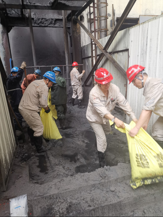 上午10時,暴雨加劇,主機(jī)集控室開始大量漏水,吊頂部分塌落,下方的電子設(shè)備間漏水嚴(yán)重,部分參數(shù)失真;汽機(jī)房外的廠內(nèi)主路積水達(dá)50公分;煤溝進(jìn)水;廠前區(qū)全部停電、大門外波濤洶涌;墻外從山上下來的山洪更是濁浪排空。危急關(guān)頭,首陽山項目部20余名黨員干部職工積極參與防汛行動,用沙袋堵塞缺口,加固堤壩,險情逐漸消除。17時,首陽山發(fā)電公司運(yùn)煤通道路基塌方,燃煤運(yùn)輸中斷。險情就是命令!面對只有兩天用量的煤炭庫存,項目部人員積極參與到首陽山發(fā)電公司抗洪搶險隊伍中,共筑防汛抗洪“同心堤”。經(jīng)過連續(xù)八個小時團(tuán)結(jié)奮戰(zhàn),燃煤供應(yīng)線路逐步恢復(fù),大唐人抵抗住了偃師幾十年罕見的暴雨襲擊,為地方抗洪搶險、保障城市安全電力貢獻(xiàn)了力量。