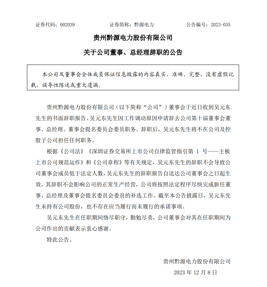 黔源電力12月8日發(fā)布公告稱,公司董事會于近日收到吳元東先生的書面辭職報告。吳元東先生因工作調(diào)動原因申請辭去公司第十屆董事會董事、總經(jīng)理、董事會提名委員會委員職務(wù)。辭職后,吳元東先生將不在公司及控股子公司擔(dān)任任何職務(wù)。