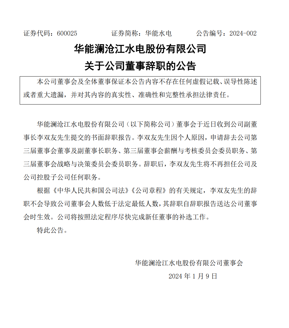 李雙友辭去華能瀾滄江水電股份有限公司(以下簡稱“華能水電”)董事及副董事長職務(wù)等職務(wù)。
