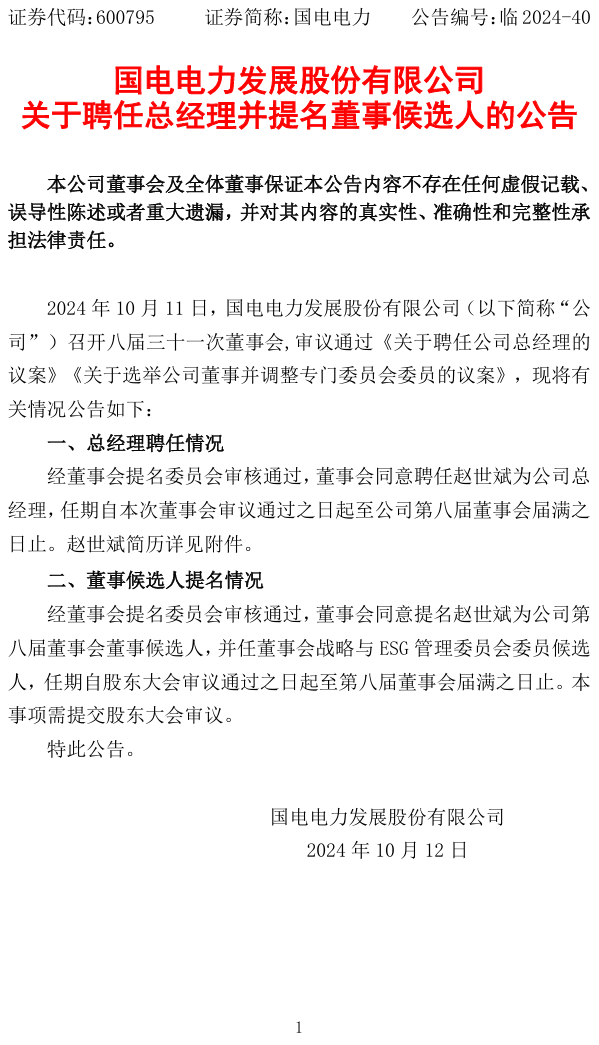 2024年10月11日,國(guó)電電力召開八屆三十一次董事會(huì),審議通過《關(guān)于聘任公司總經(jīng)理的議案》《關(guān)于選舉公司董事并調(diào)整專門委員會(huì)委員的議案》。經(jīng)董事會(huì)提名委員會(huì)審核通過,董事會(huì)同意聘任趙世斌為公司總經(jīng)理,任期自本次董事會(huì)審議通過之日起至公司第八屆董事會(huì)屆滿之日止。經(jīng)董事會(huì)提名委員會(huì)審核通過,董事會(huì)同意提名趙世斌為公司第八屆董事會(huì)董事候選人,并任董事會(huì)戰(zhàn)略與ESG管理委員會(huì)委員候選人,任期自股東大會(huì)審議通過之日起至第八屆董事會(huì)屆滿之日止。