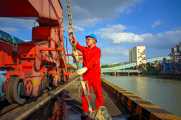 圖為燃料維護人員在檢查卸船機防風纜