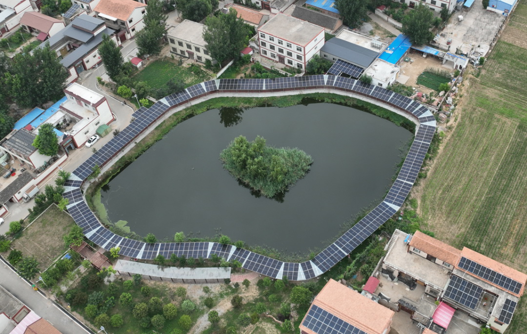 ▲河南省蘭考縣付樓村利用坑塘周圍區(qū)域搭建光伏長(zhǎng)廊