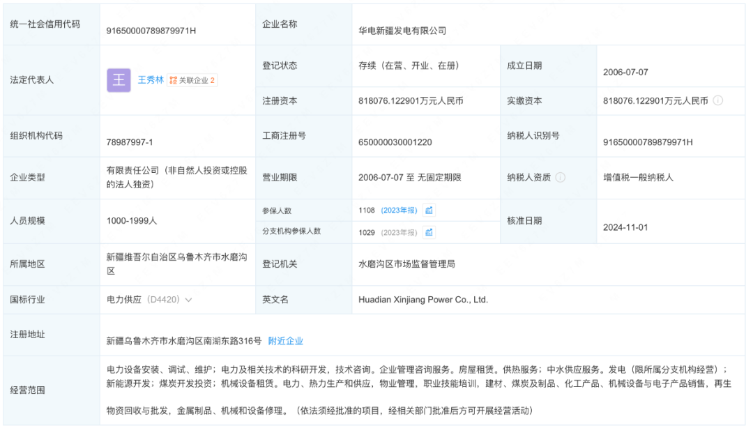近日,華電新疆發(fā)電有限公司發(fā)生工商變更,韓嵩卸任法定代表人、董事長(zhǎng),由王秀林接任并擔(dān)任董事,注冊(cè)資本由約8.92億人民幣增至約81.81億元人民幣,同時(shí)多位主要人員也發(fā)生變更。