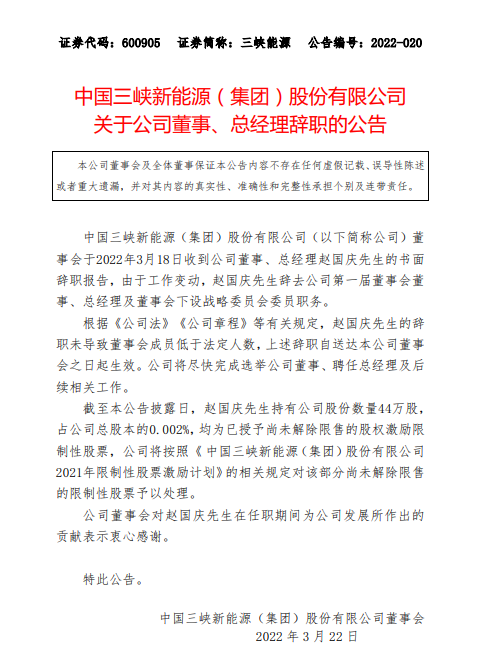 3月21日,三峽能源發(fā)布公告稱,公司董事會(huì)于3月18日收到公司董事、總經(jīng)理趙國(guó)慶的書(shū)面辭職報(bào)告,由于工作變動(dòng),趙國(guó)慶先生辭去公司第一屆董事會(huì)董事、總經(jīng)理及董事會(huì)下設(shè)戰(zhàn)略委員會(huì)委員職務(wù)。