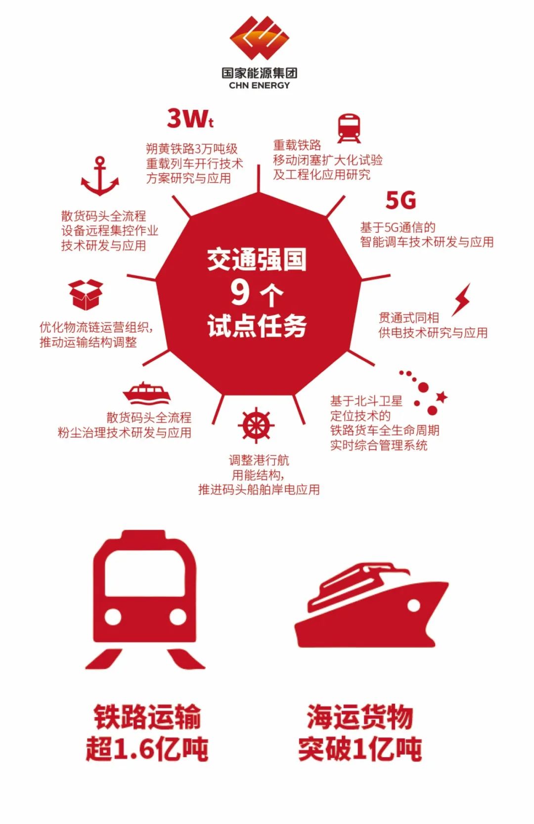 為貫徹落實黨的十九大關于建設交通強國的戰(zhàn)略部署,國家能源集團承擔了《朔黃鐵路3萬噸級重載列車開行技術(shù)方案研究與應用》《基于北斗衛(wèi)星定位技術(shù)的鐵路貨車全生命周期實時綜合管理系統(tǒng)》《重載鐵路移動閉塞擴大化試驗及工程化應用研究》《貫通式同相供電技術(shù)研究與應用》《基于5G通信的智能調(diào)車技術(shù)研發(fā)與應用》《調(diào)整港行航用能結(jié)構(gòu),推進碼頭船舶岸電應用》《散貨碼頭全流程粉塵治理技術(shù)研發(fā)與應用》《優(yōu)化物流鏈運營組織,推動運輸結(jié)構(gòu)調(diào)整》《散貨碼頭全流程設備遠程集控作業(yè)技術(shù)研發(fā)與應用》等9個試點任務,對能源供給安全和交通強國建設起到了引領示范作用。