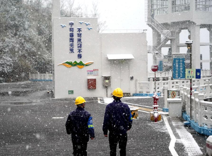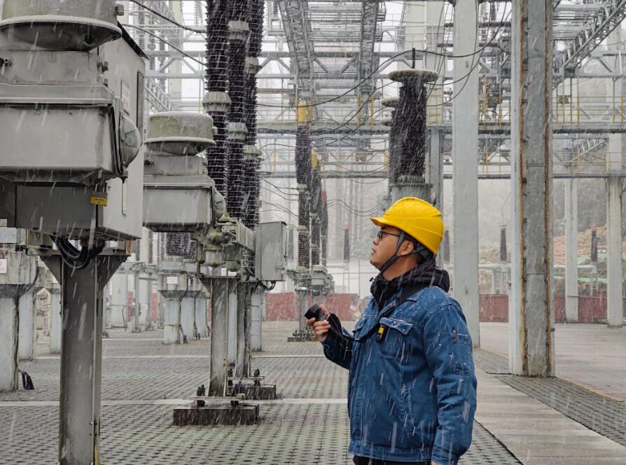 暴雪突至,浙江烏溪江公司運(yùn)行人員在湖南鎮(zhèn)電站220KV開(kāi)關(guān)站加強(qiáng)室外巡檢。