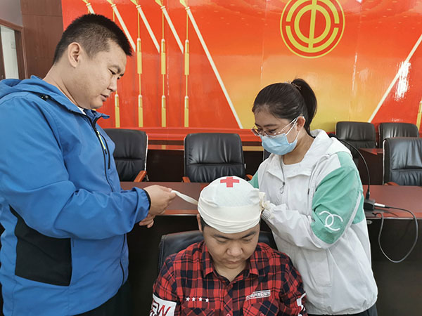 職工進行傷員包扎練習