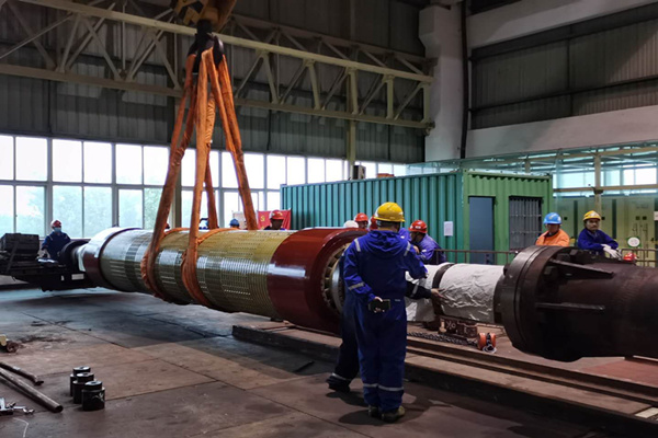 下午14時10分,隨著起重指揮人員的一聲哨響,發(fā)電機抽轉(zhuǎn)子工作正式開始,抽出期間,各專業(yè)人員分工有序,密切配合,時刻注意轉(zhuǎn)子與定子的間隙,及時調(diào)整轉(zhuǎn)子的移出量和中心位置,每一步都做到精益求精。整個抽出過程中,公司副總經(jīng)理張旭耀攜各部門負責人、專工現(xiàn)場監(jiān)督、指導,隨時協(xié)調(diào)工作中可能出現(xiàn)的問題,為抽轉(zhuǎn)子作業(yè)的順利進行,提供了可靠保障。
