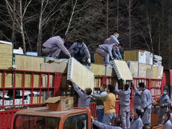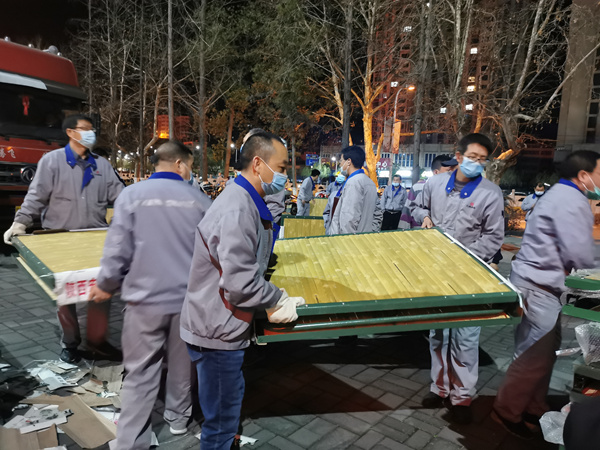 晚上21:40,行軍床運(yùn)到,中層干部、共產(chǎn)黨員、一線職工不分你我、爭(zhēng)先恐后爬上卡車搬運(yùn)。“大家戴上手套,注意安全,別傷著自己。”就在此時(shí),一直掛念著駐廠職工們的該公司黨委書記、總經(jīng)理任寶銅也來到了現(xiàn)場(chǎng),親切的囑咐大家做好防護(hù)、小心搬運(yùn)。