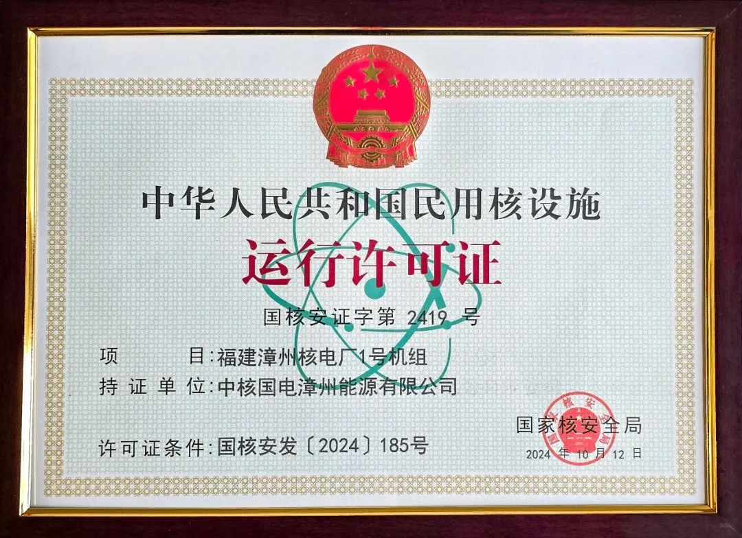 10月12日,生態(tài)環(huán)境部向中核集團旗下中國核電(股票代碼:601985)投資控股的漳州核電1號機組頒發(fā)運行許可證。生態(tài)環(huán)境部副部長、國家核安全局局長董保同出席儀式并為漳州能源頒發(fā)許可證,中核集團黨組成員、副總經(jīng)理張凱出席并見證頒證儀式。15時18分,漳州核電1號機組開始裝載首爐核燃料,標(biāo)志著機組進入主系統(tǒng)帶核調(diào)試階段,為后續(xù)機組臨界、并網(wǎng)發(fā)電等工作奠定了堅實基礎(chǔ)。