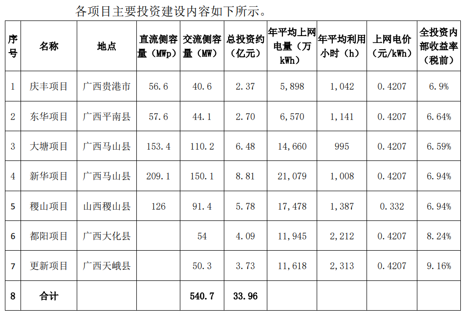 慶豐項(xiàng)目等5個(gè)光伏項(xiàng)目建設(shè)期約4-6個(gè)月,都陽(yáng)項(xiàng)目、更新項(xiàng)目?jī)蓚€(gè)風(fēng)電項(xiàng)目建設(shè)期約12個(gè)月。