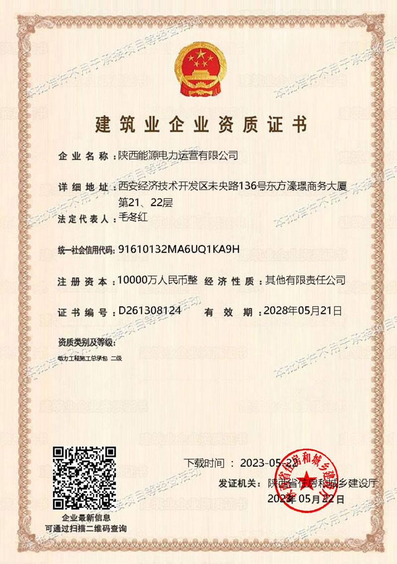 陜投電力運(yùn)營順利取得電力工程施工總承包二級資質(zhì)