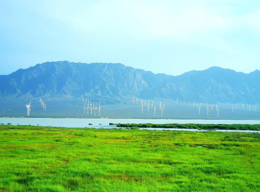 濕地旁的粵水電達坂城風(fēng)電場