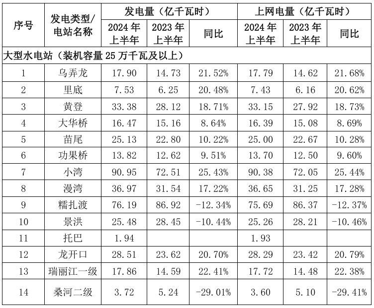 公司所屬各電站2024年上半年發(fā)電量具體如下: