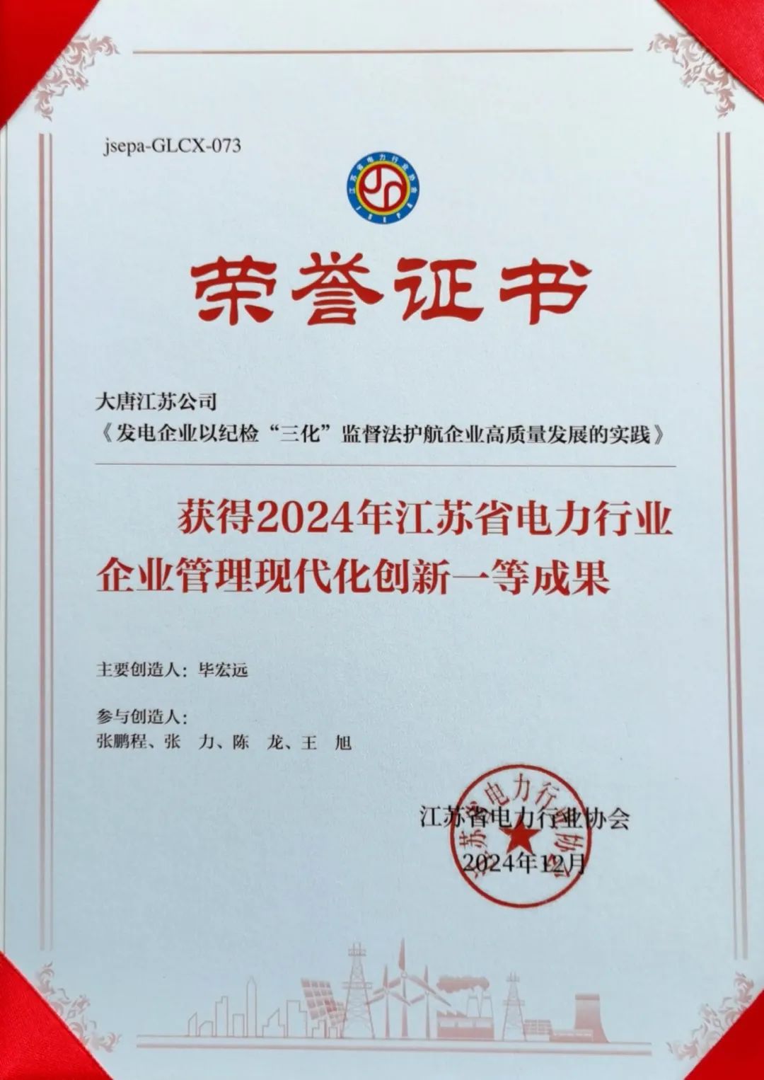 大唐江蘇公司紀(jì)委榮獲江蘇省電力行業(yè)企業(yè)管理現(xiàn)代化創(chuàng)新“一等成果”