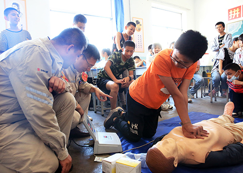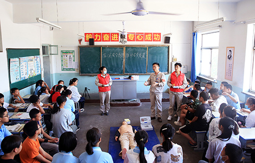 活動現(xiàn)場,青年志愿者給孩子們發(fā)放了安全環(huán)保宣傳手冊及宣傳單,給孩子們認(rèn)真講解交通安全、消防滅火和生活中的安全防護(hù)知識,緊緊圍繞“落實(shí)安全責(zé)任、筑推動安全發(fā)展”主題,為孩子們進(jìn)行“面對面、零距離、互動式”宣講、普及、解答有關(guān)應(yīng)急救援知識。并借助橡皮人給孩子們培訓(xùn)心肺復(fù)蘇急救知識,詳細(xì)講解操作流程和注意事項(xiàng),指導(dǎo)孩子們親自上手操作實(shí)踐,提升孩子們的應(yīng)急防護(hù)能力。該公司團(tuán)委書記給孩子們講黨史、新中國史、改革開放史和社會主義發(fā)展史“四史”微團(tuán)課,現(xiàn)場教孩子們學(xué)唱《強(qiáng)國一代有我在》愛國歌曲,鼓勵孩子們熱愛祖國、努力學(xué)習(xí),砥礪奮進(jìn),勇敢追夢。