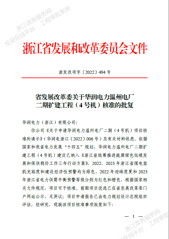 11月8日,華潤電力浙江公司溫州電廠4號機(jī)正式獲得浙江省發(fā)展和改革委員會核準(zhǔn)批復(fù)。
