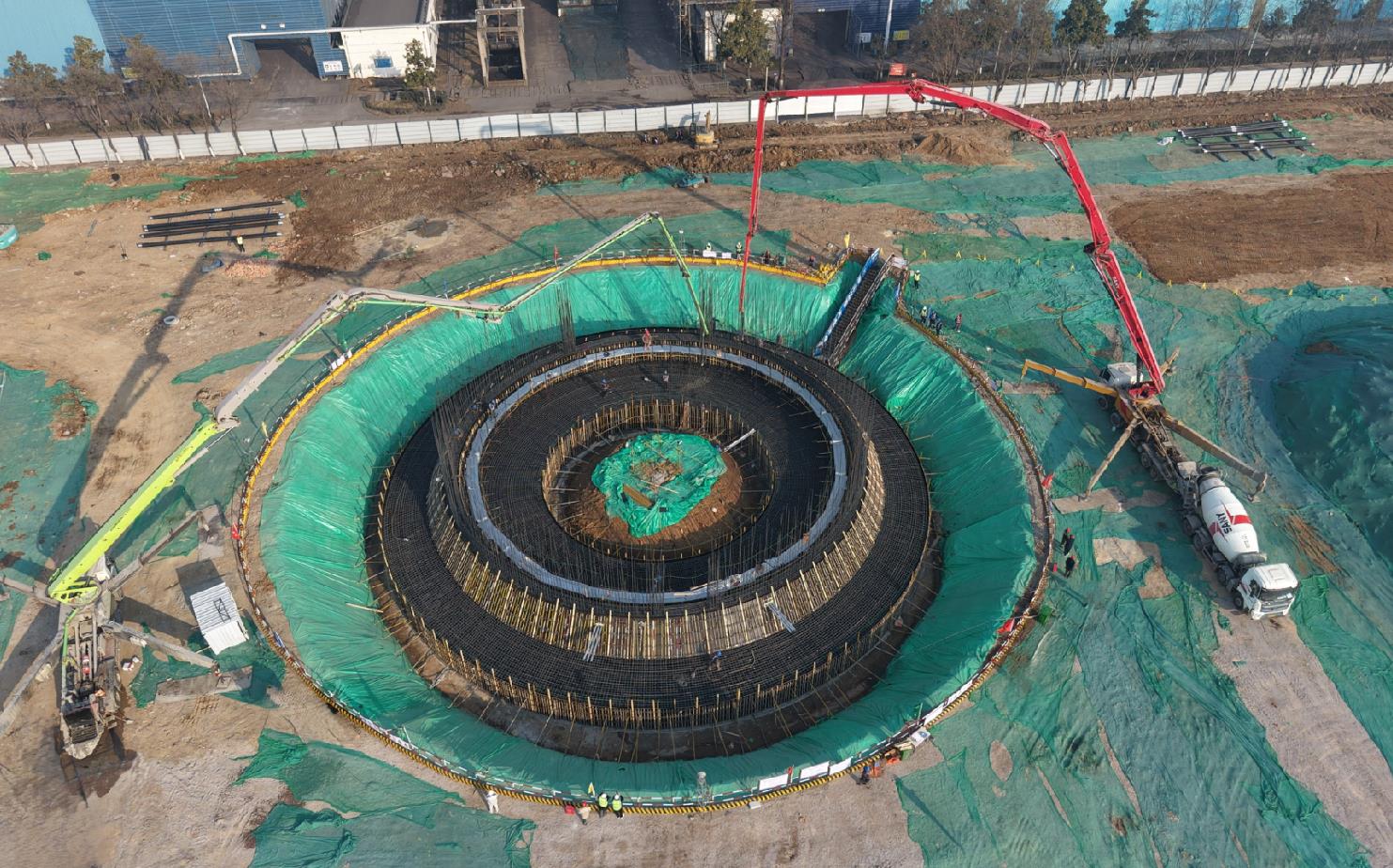 此次7號鍋爐和煙囪基礎(chǔ)采取不間斷接續(xù)施工方式,自1月17日7時40分開始,歷經(jīng)4天4夜奮戰(zhàn),先后完成了兩區(qū)域大體積混凝土澆筑任務(wù)。7號鍋爐筏板長45.9米、寬44.7米,基礎(chǔ)混凝土厚度2.3米,采用2臺63米汽車泵和1臺56米汽車泵,澆筑混凝土總量4673方。煙囪基礎(chǔ)為環(huán)板式,外直徑為38米,澆筑采取用二備一泵車配置,總澆筑方量達(dá)2451方。尤為值得一提的是,煙囪基礎(chǔ)自2024年12月26日開挖,于2025年1月20日澆筑完成,僅歷時25天,打破了該公司煙囪基礎(chǔ)施工的最短工期紀(jì)錄。