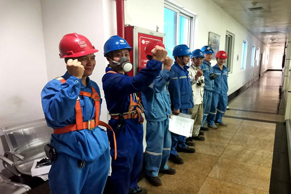 集控室走廊,該公司檢修部和拓奇項目部鍋爐檢修人員用堅守?fù)纹鹱顮N爛的笑容。他們嚴(yán)陣以待,待壓力到位保壓后進(jìn)行系統(tǒng)全面檢查工作,為6號鍋爐水壓試驗作好準(zhǔn)備。