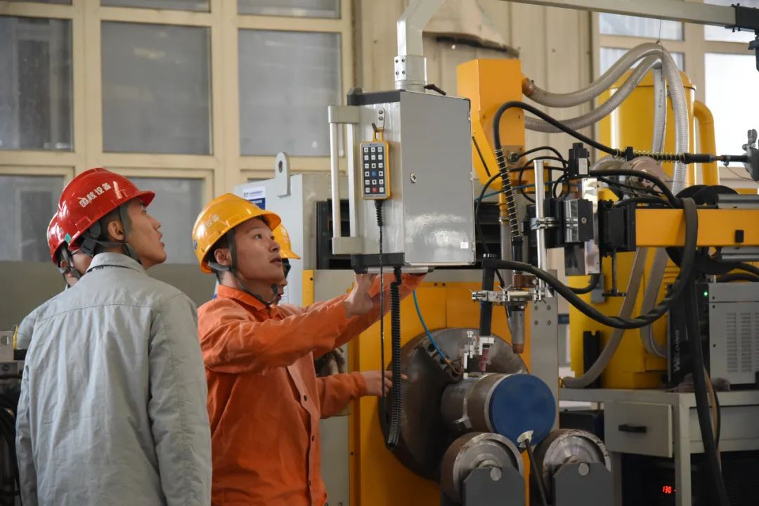 豆存印正在與同事操作調(diào)試新設(shè)備管道埋弧自動(dòng)焊機(jī)。