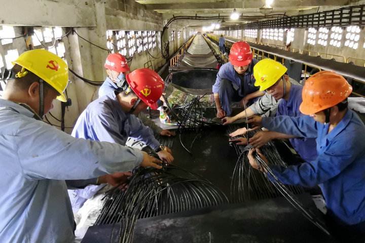 P106B膠帶整體更換膠帶全長2300米,共需硫化接頭20個,是整個輸煤系統(tǒng)膠帶更換工作中最難啃的一塊"硬骨頭"。為確保此次膠帶更換工作順利完成,該公司多次召開檢修專題討論會,制定了組織、安全、技術措施及詳細的施工方案,成立兩個硫化組,一個物資保障收放組,實行24小時輪班作業(yè),保證施工的持續(xù)性和連貫性。針對舊膠帶的拆除、拖拽、新膠帶的吊裝、鋪設等施工難點,創(chuàng)新工作思路,開展技術攻關破解難題,自制了自動卷帶機,減少了人工投入,極大提高了工作效率,特別是在攻克硫化接頭方面,嚴格施工標準和工藝流程操作,經過斷帶、剝鋼絲繩、芯膠面膠鋪整、硫化機緊固、加壓、加熱、再進行保溫降溫等施工程序,每個頭用時8多個小時,做到精益求精,確保一次硫化成功,保證硫化質量。