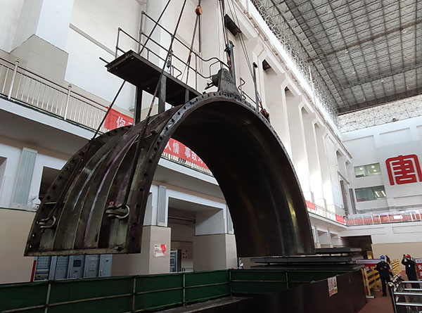 中國電力網(wǎng)訊 11月6日9時(shí)30分,隨著指揮人員哨聲響起,內(nèi)蒙古大唐國際海勃灣水利樞紐開發(fā)有限公司2號(hào)機(jī)組轉(zhuǎn)輪室上半部緩緩吊起,并順利固定在主安裝間,此次2號(hào)機(jī)組轉(zhuǎn)輪室上半部順利吊出為后續(xù)2號(hào)機(jī)組轉(zhuǎn)輪吊裝工作奠定了良好基礎(chǔ)。