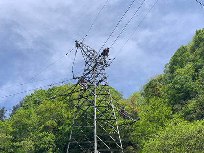 此次維保檢修的二郎壩發(fā)電35kV臥天架空輸配電線路全長約18公里,共有桿塔43級,其中鐵塔22級,混凝土水泥桿塔21級,均為山區(qū)架空線路,且位于陜南山區(qū),叢林密布、道路濕滑,檢修維保工作難度大。施工前,電力運營提前抽調專業(yè)技術人員對現(xiàn)場情況進行實地勘察,就天氣情況、檢修方案、危險點進行分析討論,梳理設備缺陷隱患,并制定了完善的檢修方案及“三措兩案”。檢修人員披荊斬棘、逐桿逐級檢修,共計消除桿塔金具缺陷339條、更換破損絕緣子5片、更換避雷器1組,有效地提高了輸電線路設備的健康和運行水平,以優(yōu)質、高效的檢修成果確保了業(yè)主方輸電線路安全可靠運行。