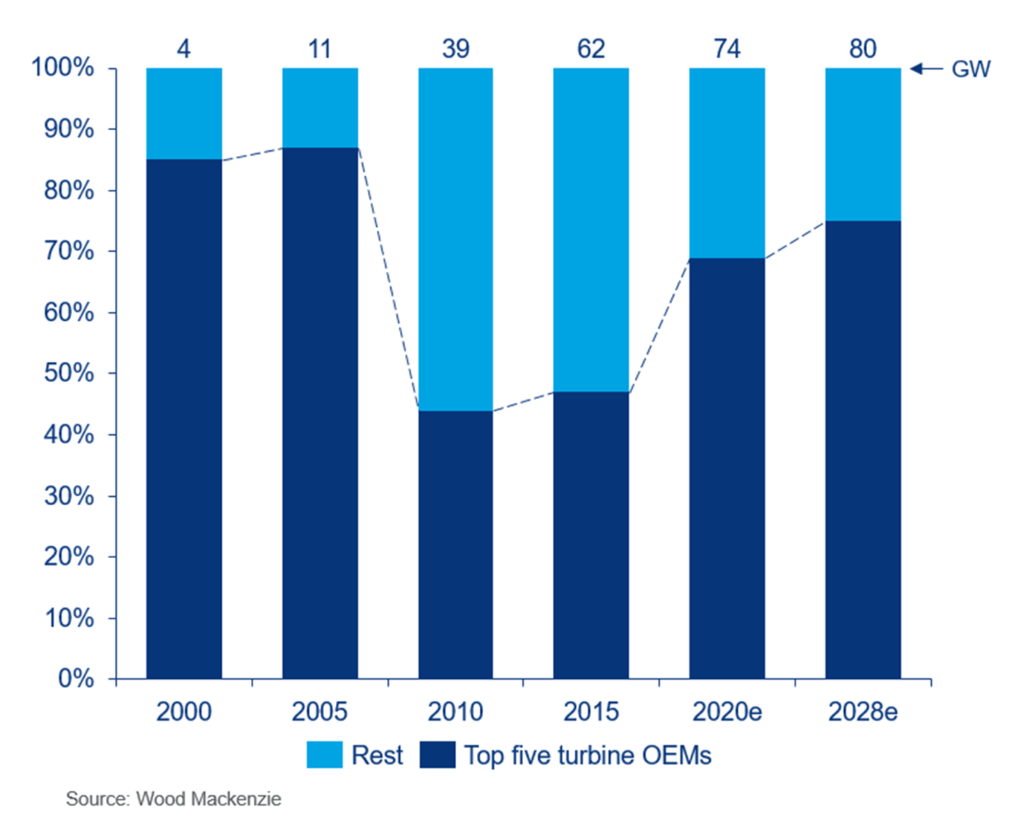 根據(jù)伍德·麥肯齊(Wood Mackenzie)的最新研究,到2028年,領(lǐng)先的三大風力渦輪機原始設(shè)備制造商的市場份額將從2019年的47%(即32GW)增長到60%以上(即48GW)。