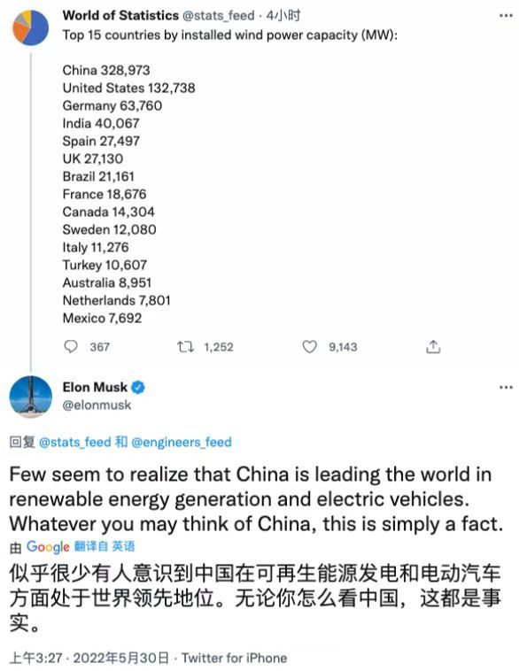 馬斯克:中國(guó)風(fēng)電裝機(jī)容量領(lǐng)先美國(guó)兩倍多
