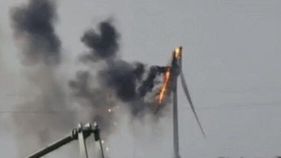 根據(jù)目擊者和消防員提供的視頻,這臺風(fēng)力渦輪發(fā)電機(jī)被雷擊中后,葉片邊旋轉(zhuǎn)邊燃燒,被燒焦后掉落,現(xiàn)場濃煙滾滾。