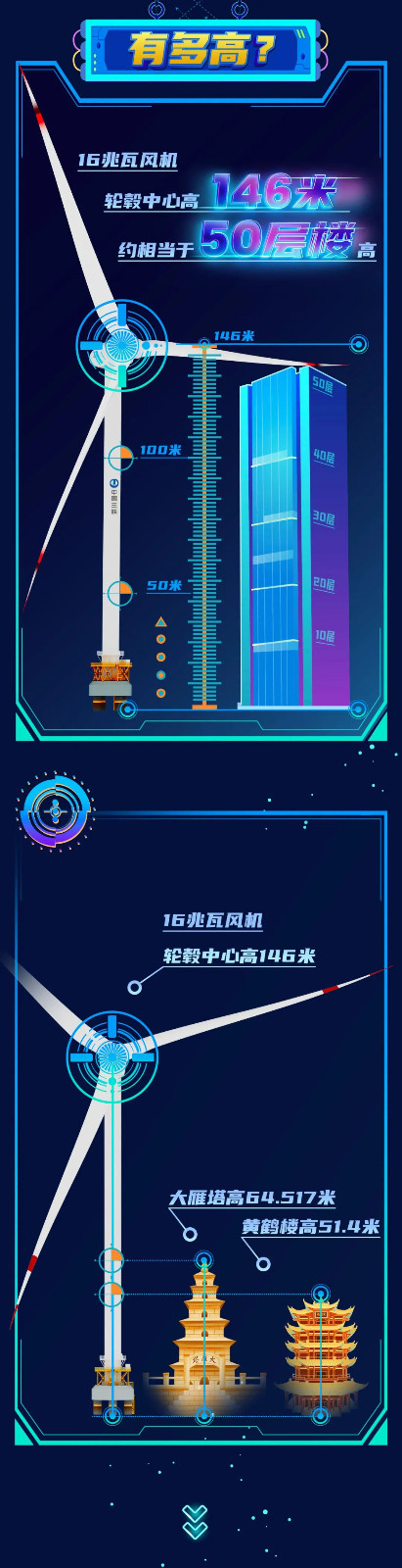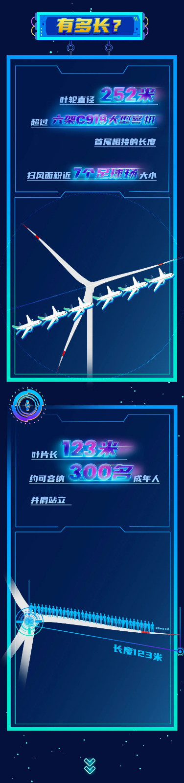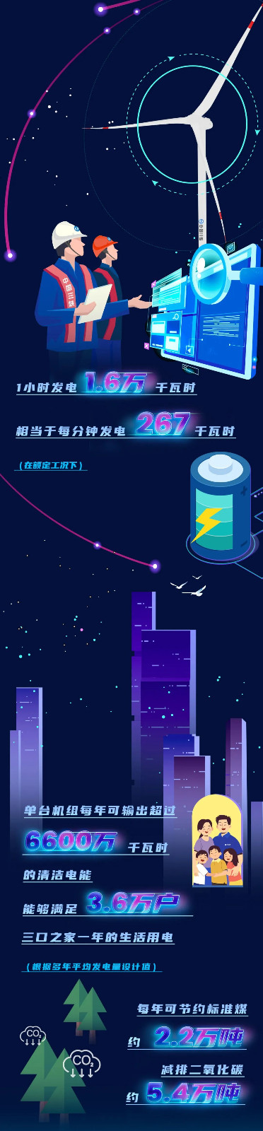 此次下線的單機(jī)容量16兆瓦海上風(fēng)電機(jī)組,葉輪直徑252米,葉輪掃風(fēng)面積約5萬平方米,約相當(dāng)于7個(gè)標(biāo)準(zhǔn)足球場(chǎng)大;輪轂高度達(dá)146米,約相當(dāng)于一座50層大樓的高度。在額定工況下,單臺(tái)機(jī)組每轉(zhuǎn)動(dòng)一圈可發(fā)電34.2千瓦時(shí)。根據(jù)多年平均發(fā)電量設(shè)計(jì)值,單臺(tái)機(jī)組每年可輸出超過6600萬千瓦時(shí)的清潔電能,能夠滿足3.6萬戶三口之家一年的生活用電,可節(jié)約標(biāo)煤約2.2萬噸,減排二氧化碳約5.4萬噸。