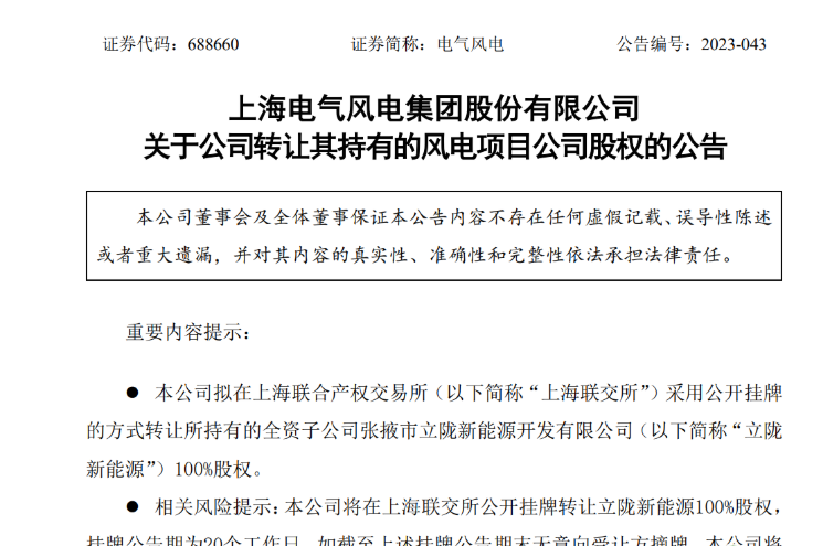 公告披露,電氣風電擬在上海聯(lián)合產(chǎn)權交易所采用公開掛牌的方式轉讓所持有的全資子公司張掖市立隴新能源開發(fā)有限公司(簡稱:立隴新能源)100%股權,立隴新能源持有高臺縣風電項目(裝機容量為 400MW)。