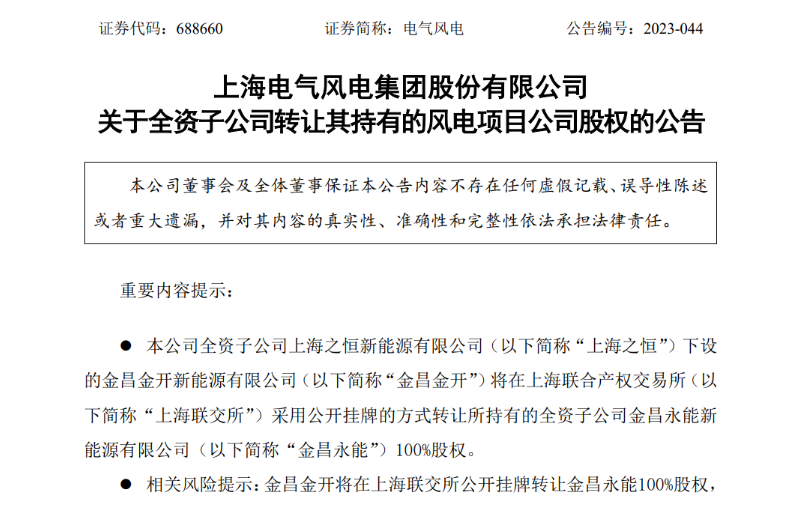 同日,電氣風電發(fā)布《關于全資子公司轉讓其持有的風電項目公司股權的公告》,電氣風電全資子公司上海之恒下設的金昌金開將在上海聯(lián)合產(chǎn)權交易所采用公開掛牌的方式轉讓所持有的全資子公司金昌永能新能源有限公司(以下簡稱“金昌永能”)100%股權,金昌永能持有金昌風電項目(裝機容量為100MW)。