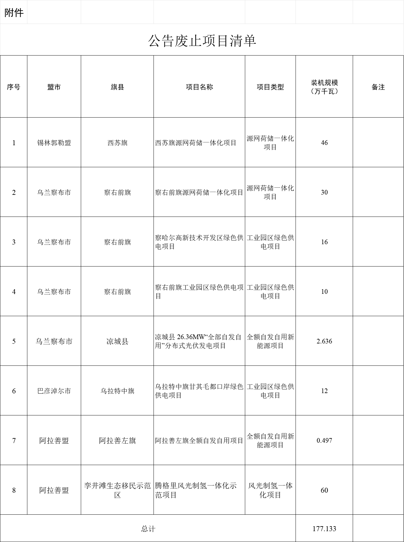按照自治區(qū)黨委、政府工作要求,2023年11月起,自治區(qū)能源局組織開展了全區(qū)新能源項(xiàng)目“再起底”工作,圍繞項(xiàng)目建設(shè)存在的問(wèn)題分類施策,督促和指導(dǎo)各盟市和有關(guān)企業(yè)加快項(xiàng)目建設(shè),同時(shí)全面實(shí)行市場(chǎng)化新能源項(xiàng)目“能進(jìn)、能出”機(jī)制,企業(yè)可隨時(shí)申報(bào)市場(chǎng)化并網(wǎng)新能源項(xiàng)目,也可隨時(shí)申請(qǐng)廢止已獲批但難以推進(jìn)的市場(chǎng)化并網(wǎng)新能源項(xiàng)目,避免無(wú)法實(shí)施的新能源項(xiàng)目圈占土地等資源。根據(jù)工作安排,現(xiàn)對(duì)2023年11月1日至2024年1月31日各盟市廢止的市場(chǎng)化并網(wǎng)新能源項(xiàng)目進(jìn)行公告。