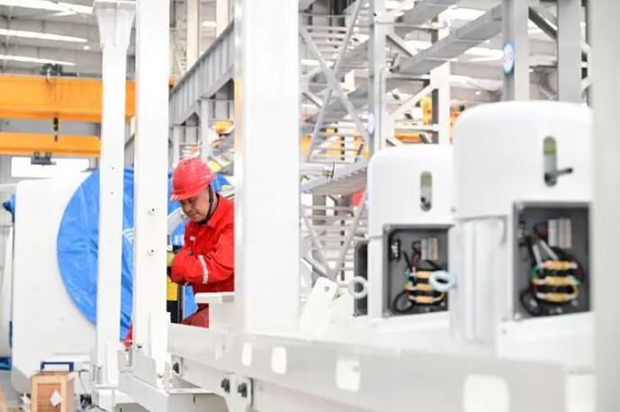 4月10日,工人在隆化縣金風(fēng)電控設(shè)備有限公司風(fēng)電車間裝配機艙。新華社記者金良快 攝