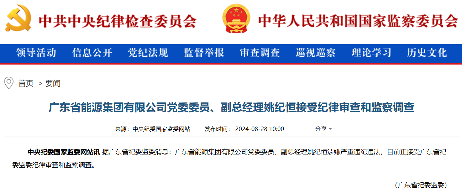 8月28日,中央紀委國家監(jiān)委網(wǎng)站訊 據(jù)廣東省紀委監(jiān)委消息:廣東省能源集團有限公司黨委委員、副總經(jīng)理姚紀恒涉嫌嚴重違紀違法,目前正接受廣東省紀委監(jiān)委紀律審查和監(jiān)察調(diào)查。