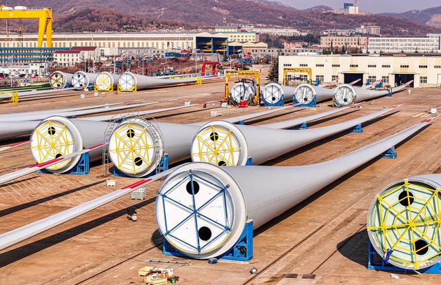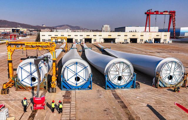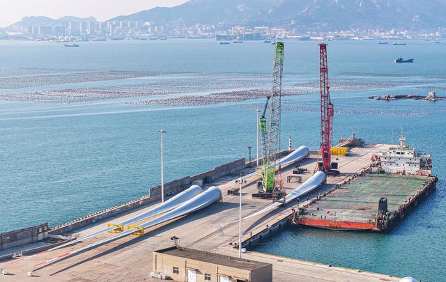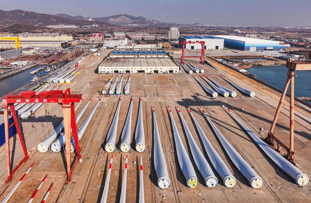 12月23日,威海榮成市石島管理區(qū)海上風(fēng)電產(chǎn)業(yè)基地,近百套超大型風(fēng)電葉片等待吊裝、運(yùn)輸至海上作業(yè)區(qū)進(jìn)行安裝。