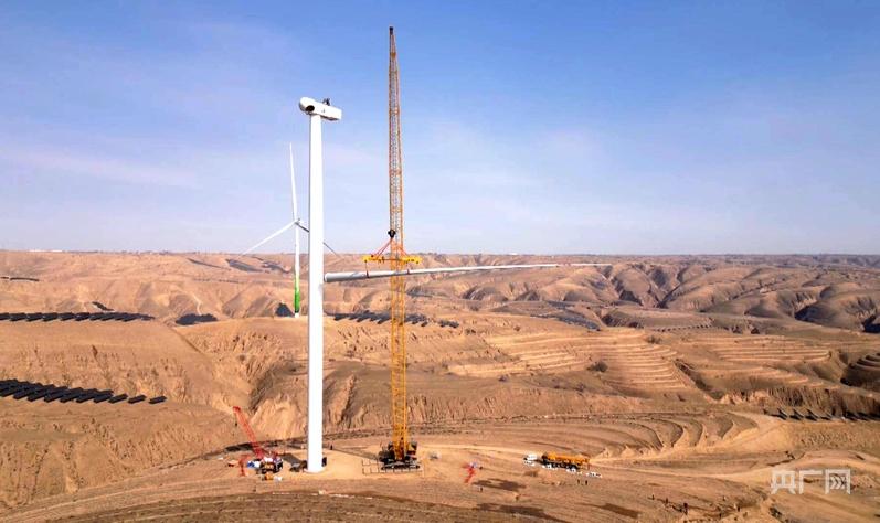 華能慶陽風(fēng)光綜合新能源示范項(xiàng)目二批D2風(fēng)光項(xiàng)目風(fēng)機(jī)吊裝現(xiàn)場(央廣網(wǎng)發(fā) 趙小強(qiáng) 攝)