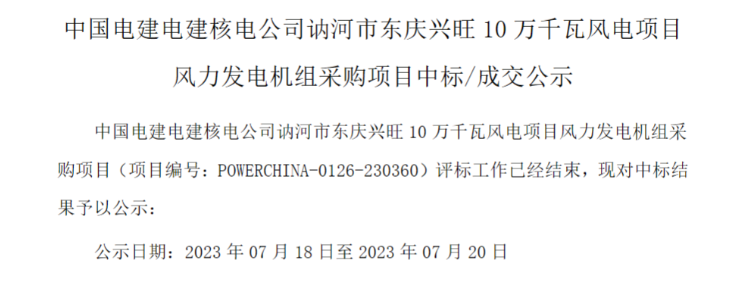 7月18日,中國電建集中采購平臺發(fā)布《中國電建電建核電公司訥河市東慶興旺10萬千瓦風電項目風力發(fā)電機組采購項目中標/成交公示》的公告。