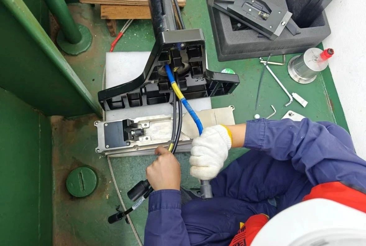 三峽能源江蘇運維公司海工試驗中心員工將多波束測深系統(tǒng)換能器從海里收回