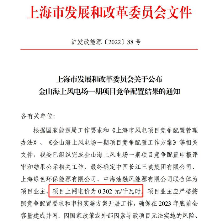 今年4月,上海市發(fā)改委公布了金山海上風(fēng)電場(chǎng)一期項(xiàng)目競(jìng)爭(zhēng)配置結(jié)果,最終確定中國長(zhǎng)江三峽集團(tuán)有限公司、上海綠色環(huán)保能源有限公司、中海油融風(fēng)能源有限公司聯(lián)合體為項(xiàng)目業(yè)主,項(xiàng)目上網(wǎng)電價(jià)為0.302元/千瓦時(shí)。