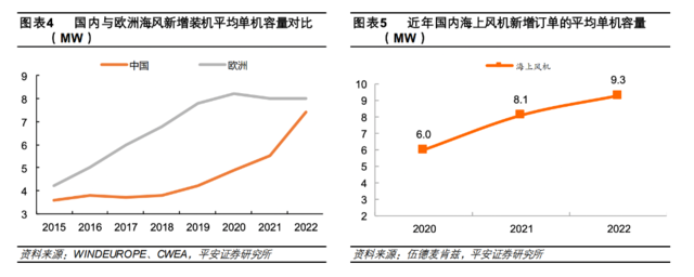 海上風機方面,整體看,歐美單機容量14-15MW、葉輪直徑236米左右的大兆瓦海上新品有望于2024-2025年開始批量交付。