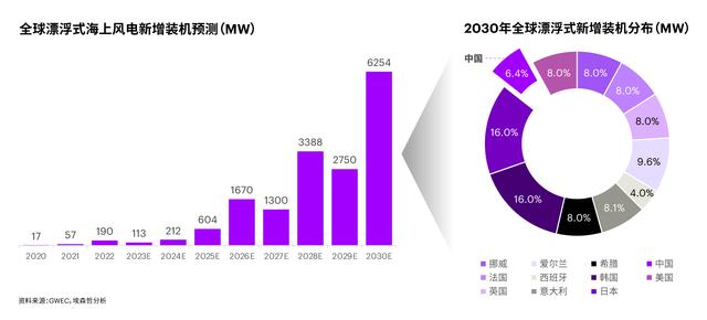 海上風電向深遠海域進發(fā):漂浮式風電為加速進軍深遠海域開辟了新前景。全球已有202.55MW的漂浮式風電項目投運,2023-2025年將有530MW漂浮式風電項目投運4。根據(jù)GWEC的預測,2026年將實現(xiàn)漂浮式風電的商業(yè)化。預計到2030年,漂浮式風電裝機規(guī)模將顯著增長,其中中國新增裝機容量將達400MW,占全球新增的6.4%。