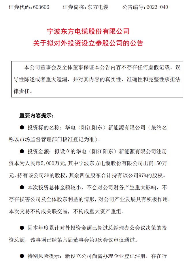 12月2日,東方電纜發(fā)布關(guān)于擬對(duì)外投資設(shè)立參股公司的公告。根據(jù)公告顯示,華電新能源集團(tuán)股份有限公司、廣東金風(fēng)科技有限公司、寧波東方電纜股份有限公司、中國(guó)水利水電第四工程局有限公司、海南程邦投資控股有限公司 五方共同出資在廣東省陽江市成立合資公司負(fù)責(zé)廣東華電陽江三山島六50萬千瓦海上風(fēng)電項(xiàng)目投資、建設(shè)、 運(yùn)營(yíng)。
