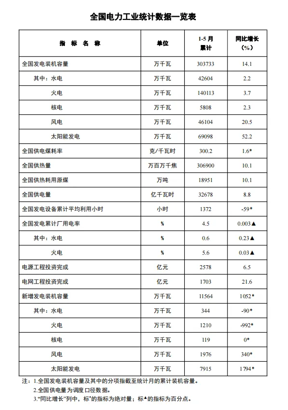 截至5月底,全國累計發(fā)電裝機容量約30.4億千瓦,同比增長14.1%。其中,太陽能發(fā)電裝機容量約6.9億千瓦,同比增長52.2%;風(fēng)電裝機容量約4.6億千瓦,同比增長20.5%。