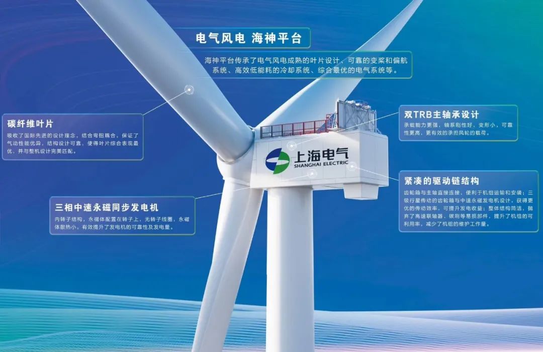 海神平臺(tái)傳承了電氣風(fēng)電成熟的葉片設(shè)計(jì)、可靠的變槳和偏航系統(tǒng)、高效低能耗的冷卻系統(tǒng)、綜合最優(yōu)的電氣系統(tǒng)等。在碳纖維葉片、雙TRB主軸承設(shè)計(jì)、三相中速永磁同步發(fā)電機(jī)、緊湊的驅(qū)動(dòng)鏈結(jié)構(gòu)等方面創(chuàng)新設(shè)計(jì),并針對(duì)不同海域的風(fēng)資源稟賦和海洋地質(zhì)條件,因地制宜,提供適合當(dāng)?shù)氐淖罴呀鉀Q方案。