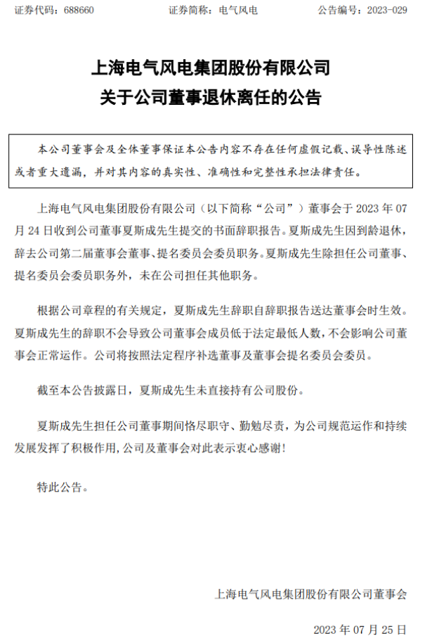 公告稱,電氣風(fēng)電董事會于2023年7月24日收到公司董事夏斯成先生提交的書面辭職報告。夏斯成先生因到齡退休,辭去公司第二屆董事會董事、提名委員會委員職務(wù)。夏斯成先生除擔(dān)任公司董事、提名委員會委員職務(wù)外,未在公司擔(dān)任其他職務(wù)。