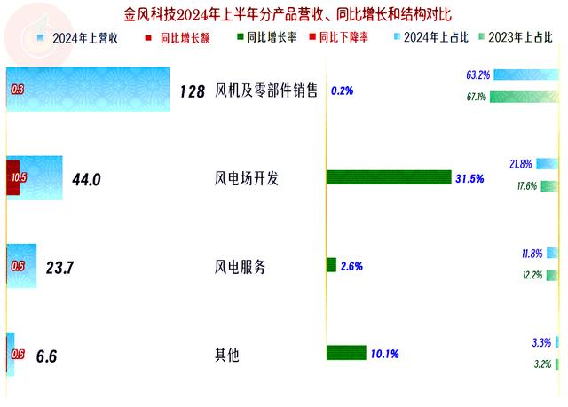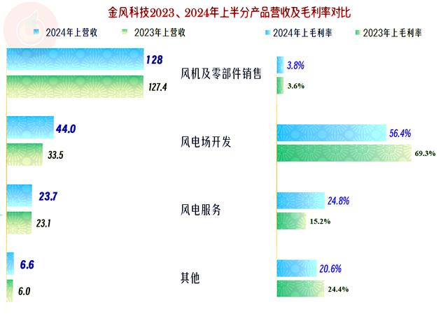 2024年上半年,金風(fēng)科技核心的“風(fēng)機(jī)及零部件銷售”業(yè)務(wù)毛利率小幅增長(zhǎng),但總體水平仍然很低;“風(fēng)電場(chǎng)開發(fā)”業(yè)務(wù)的毛利率雖然大幅下降,但仍然超過了五成;“風(fēng)電服務(wù)”業(yè)務(wù)的毛利率有較大幅度增長(zhǎng),對(duì)平均毛利率的提升起到了不小的作用。